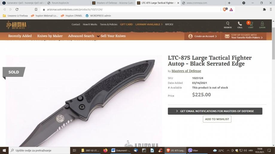 Prodajem preklopni nož Masters Of Defence (MOD) model LTC875 za 1.500,00 kuna. Nož je kupljen u Replikartu prije desetak godina, nedirnut i nikada nošen, iz kolekcije. Ovaj model više se ne proizvodi, zadnja cijena na ARIZONA KNIVES stranici za prodaju bila je 225$, ali ga nema više u prodaji.