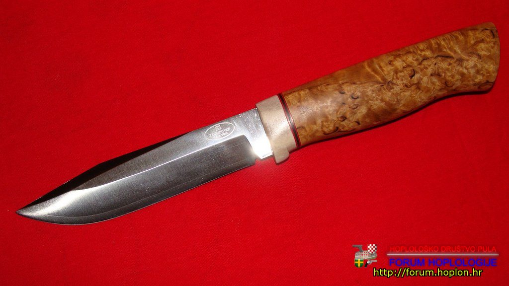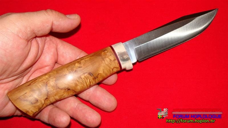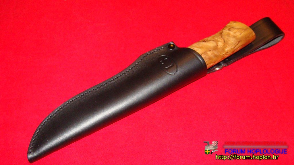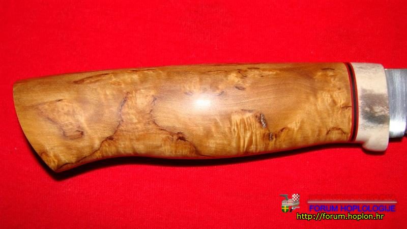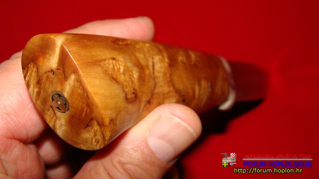 Oštrica VG 10 laminirana, debela 5 mm, duga 130 mm, full tang sa ručno rađenom drškom od stabilizirane breze i stabiliziranog roga, rad majstora Rinosa. Originalna kutija i kožne crne korice.