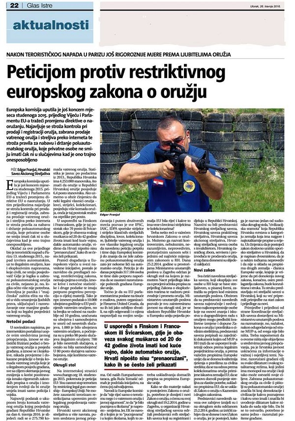 Hrvatski savez akcionog streljaštva u više navrata, putem sredstava javnog priopćavanja i putem društvenih mreža pozvao je sve IPSC, IASC, IDPA sportske strijelce i strijelce klasičnih streljačkih disciplina, lovce, kolekcionare, ljubitelje vatrenog oružja i sve vlasnike legalnog oružja da navedenu peticiju POTPIŠU i time daju Europskoj komisiji do znanja da ne žele zabranu poluautomatskog oružja zato jer nekome liči na automatsko oružje. Peticiju je do danas potpisalo 317.184 osoba te time dalo potporu naporima da se zaustavi razoružavanje poštenih građana Europske unije.