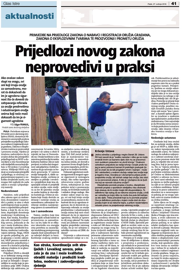 Početkom mjeseca svibnja, Hrvatski savez akcionog streljaštva (HSAS), dostavio je Ministarstvu unutarnjih poslova primjedbe na prijedloge Zakona o nabavci i registraciji oružja građana, Zakona o eksplozivnim tvarima te proizvodnji i prometu oružja. Ujedno je izraženo zadovoljstvo što je uvažen dobar dio primjedbi i prijedloga koji su MUP-u dostavljeni u ime Koordinacije svih streljačkih saveza koji djeluju u Hrvatskoj i Lovačkog saveza.