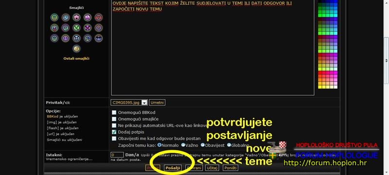 ... upisujete naslov teme i tekst kojim zelite diskutirati. Naslov teme treba biti nešto smisleno i precizno, a opet kratko. Postovi naslova "novi nož", "nabavio" i slično rijetko tko ima želje pogledati.