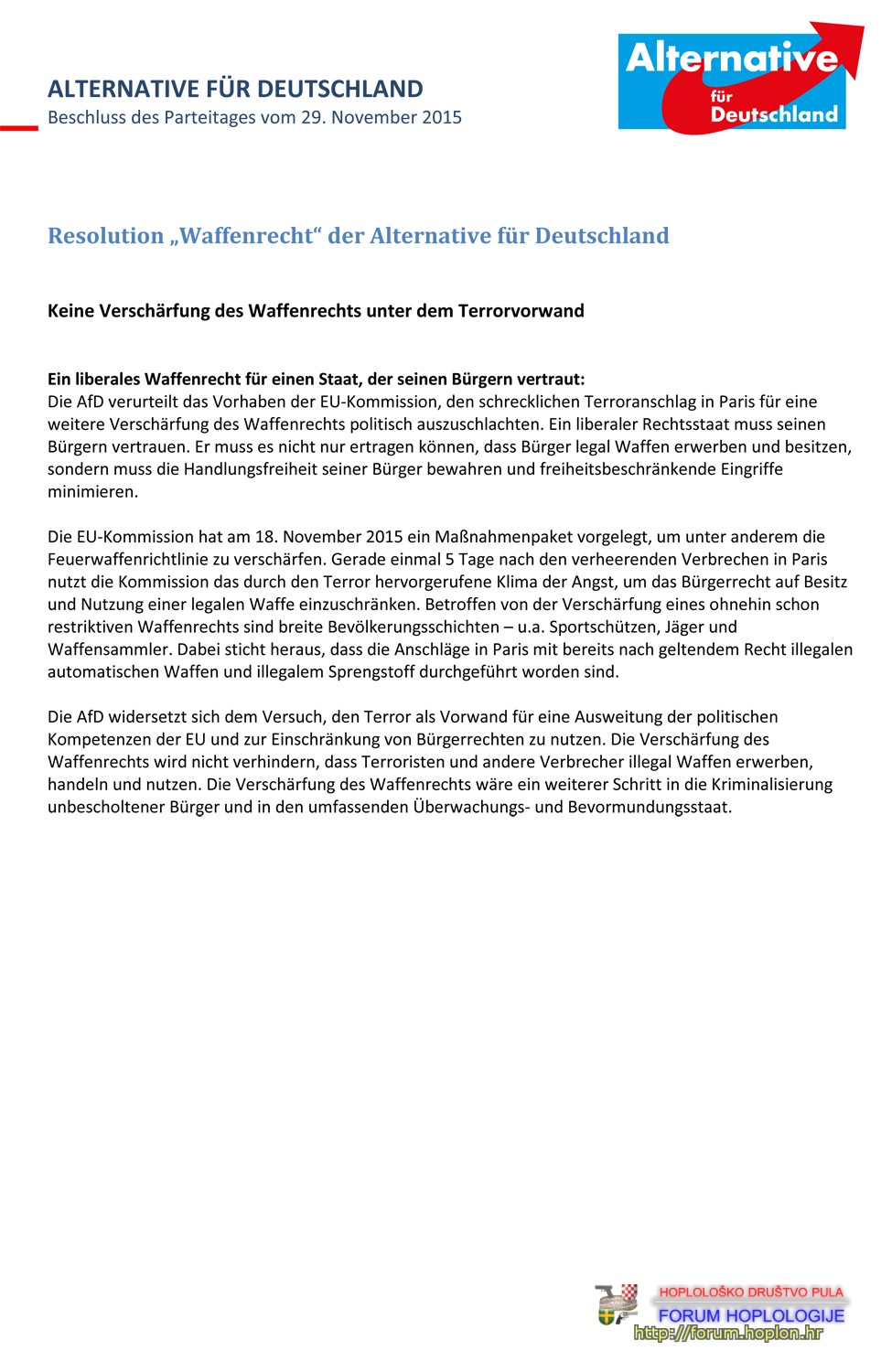 ....vielen Dank für Ihre Zuschrift zur von der Kommission geplanten Verschärfung des Waffenrechts. Ich lehne dies ab. Bitte beachten Sie die von mir beantragte und von der AfD auf ihrem letzten Parteitag einstimmig beschlossene Resolution im Anhang mit weiteren Einzelheiten. Gern verweise ich auch auf die Berichterstattung in der Bildzeitung hier: http://www.bild.de/politik/inland/petry ... .bild.html